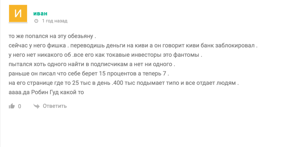 Пользователь под ником «Иван» оставил отзыв, в котором описывает, как Громов требовал у него дополнительный процент с выигрыша и не отдавал средства: